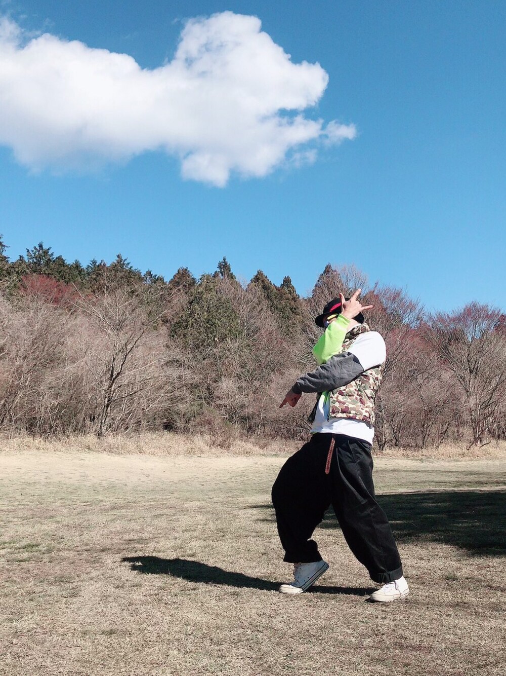 蛍光イエローとグレーのスウェットを真っ二つにして組み合わせたリメイクスウェットをつくりました! ツータックワイドパンツもお気に入りです!