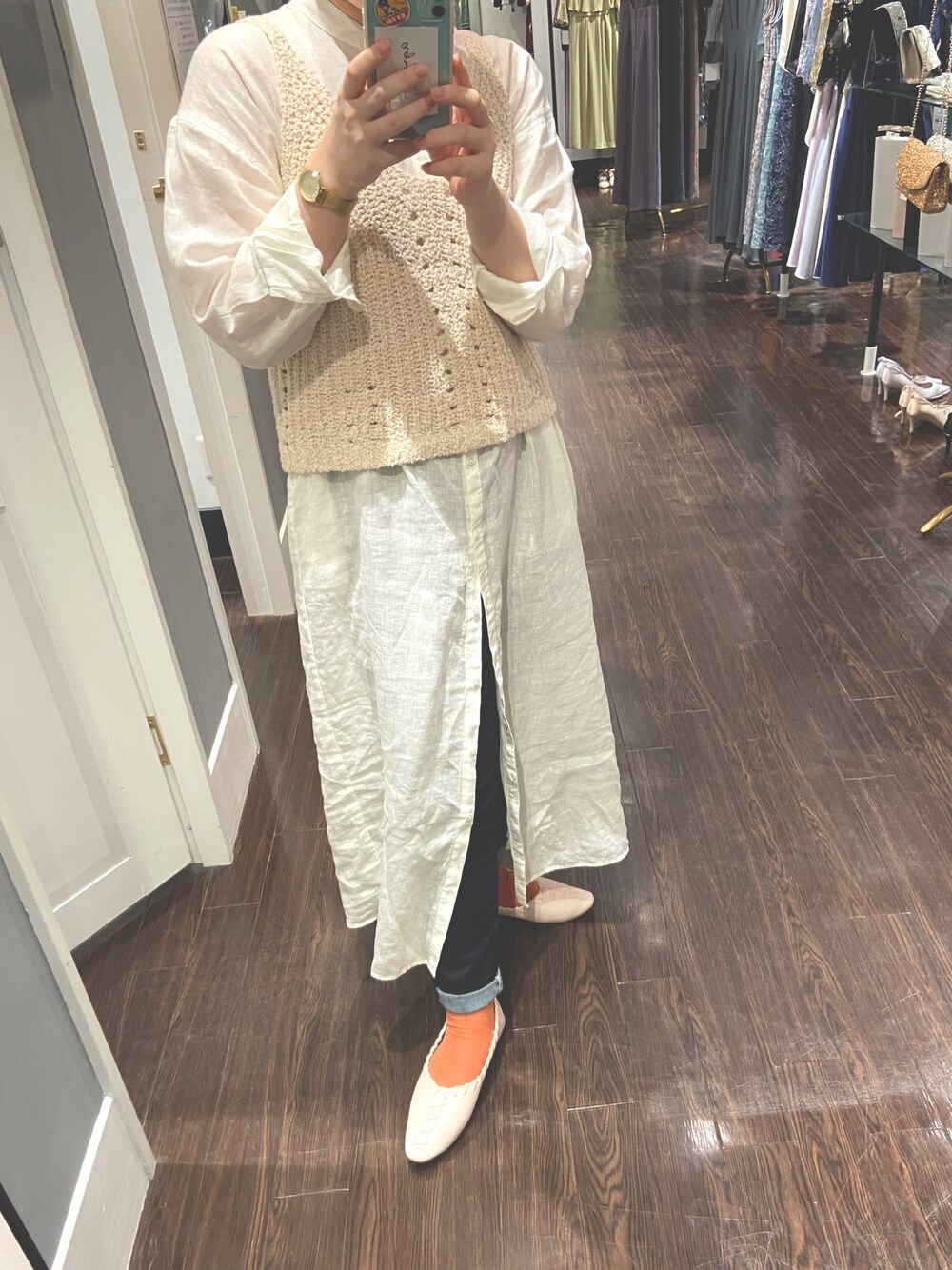 apart by lowrysでずっと狙ってた、 シャツワンピースとSM2のベストのコーデ🌷 シャツは透けちゃうからデニムをイン 最近はオレンジも好き🧦