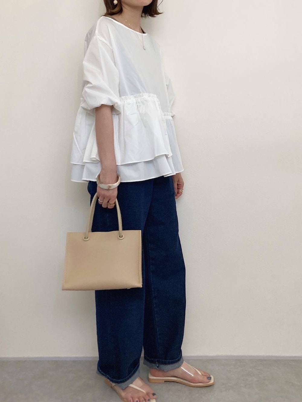 @momentplus.official T/Cブロードアシメギャザーフリルブラウス アシメになってるデザインが可愛い♡ これ着るだけで可愛いのでシンプルにデニム合わせ♩