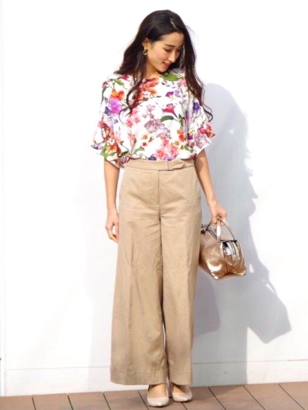 フレア袖に華やかなフラワープリントのブラウスや上品小物で、チノパンを女性らしく