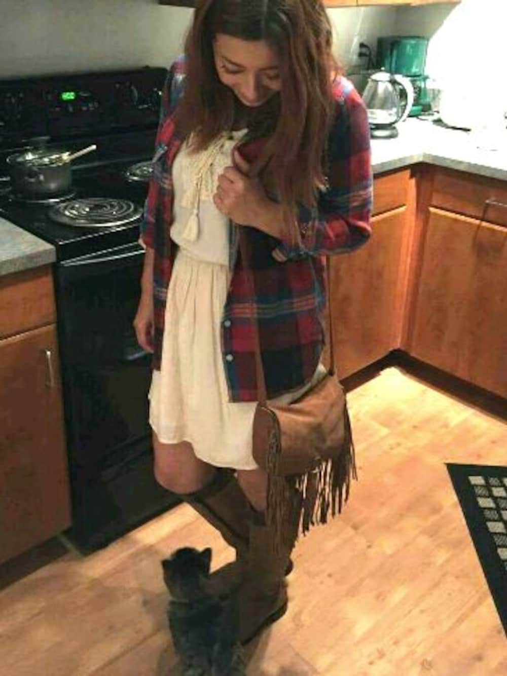 結婚1年記念日なので普段着ないワンピース。ウエスタン意識でカジュアルカワイイがすき♡♡フリンジのbagはがお気に入り♡♡