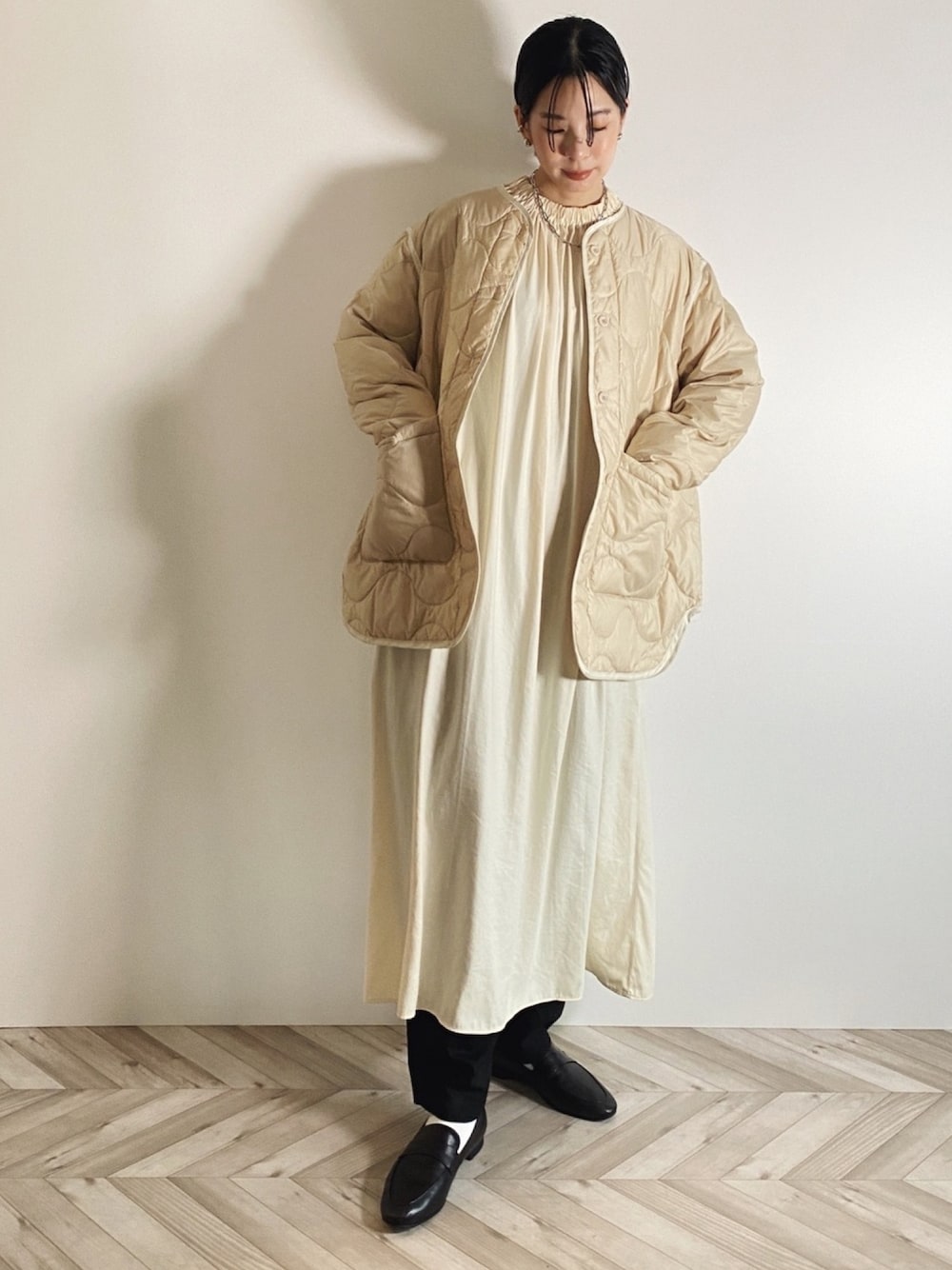 去年のTodayfulのダウンジャケット◎ 今年のワンピースと合う☺️