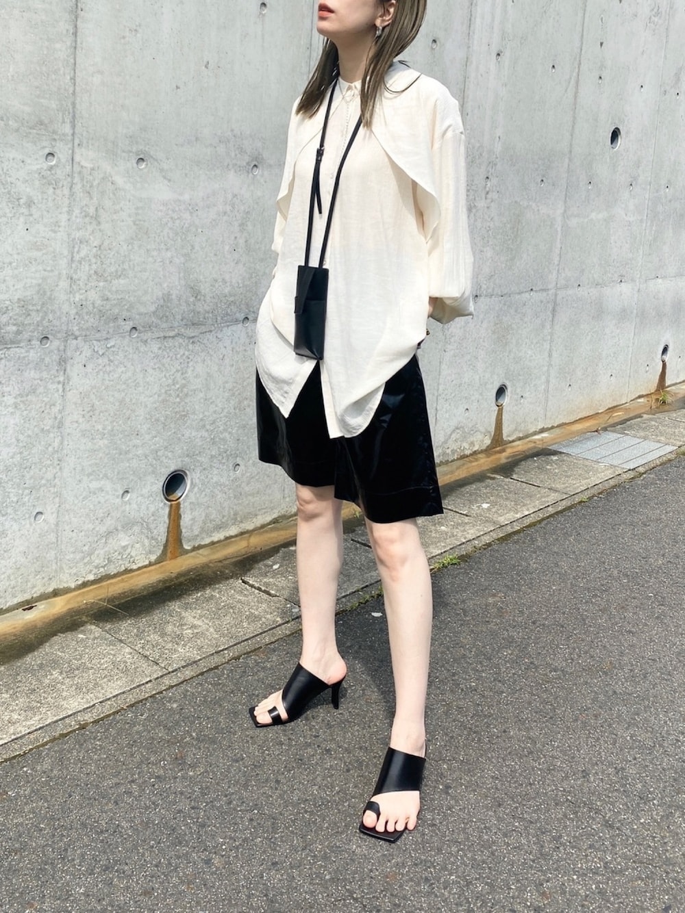 y/m × RIKAの最近のお気に入りちゃん ハーフパンツとあわせて◎ シャツはインするスタイルも好きだし アウトでずるっと着るのも好き☺️ ' 楊柳ケープシャツ ' y/m by RIKA Ivory / Black Size FREE ¥5,990 +tax