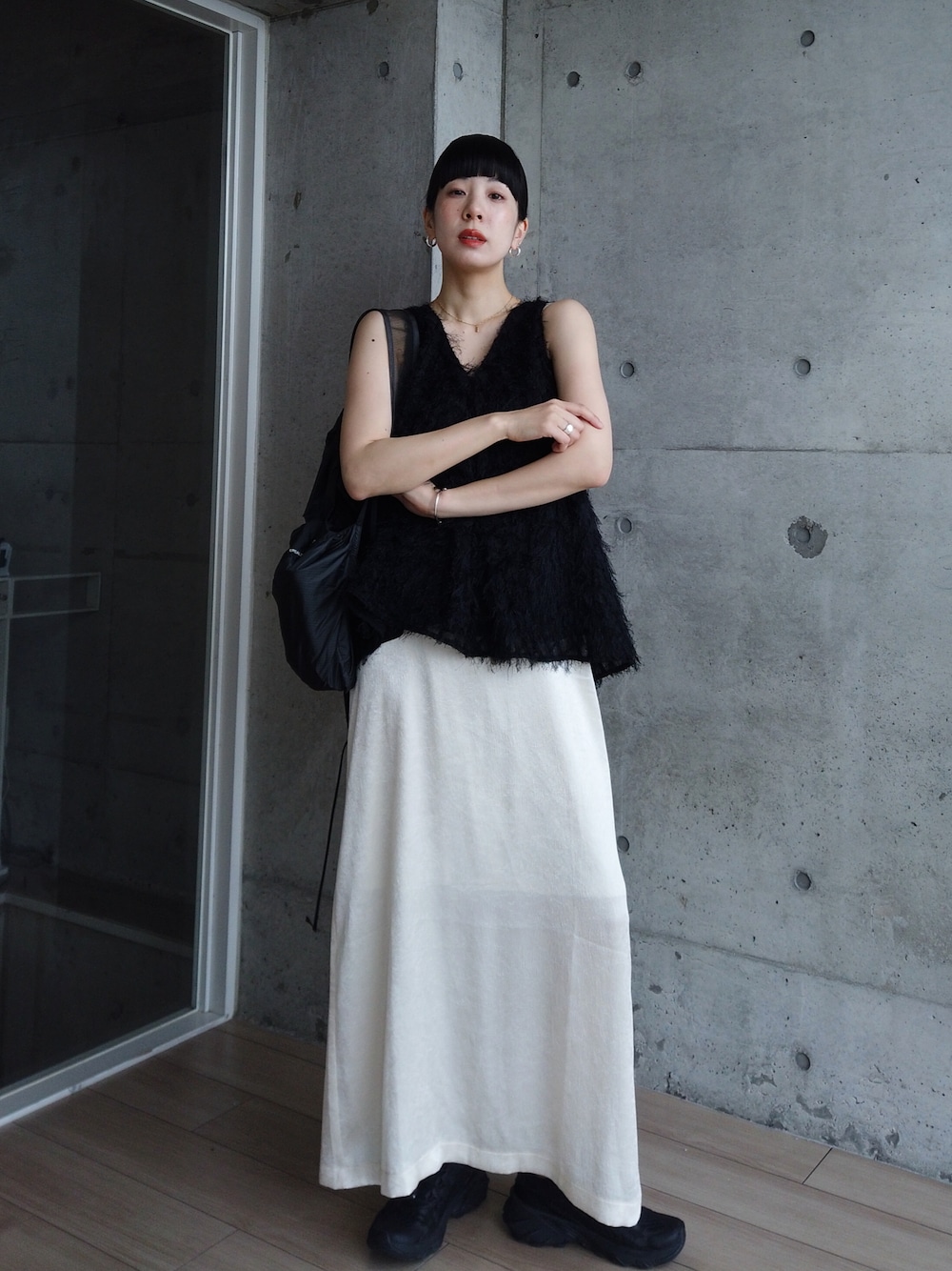 昨日から販売開始になったy/m by RIKAのサテンキャミワンピース。上からトップスを重ねてスカート風に着てみました。 きれいめなスタイリングにカジュアルなバッグや小物を合わせるのも可愛いなと思って、バッグはmont-bellのリュックを。