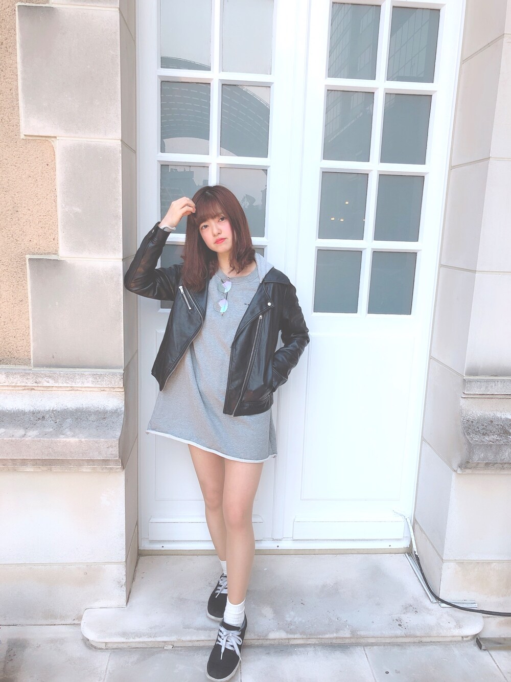 だいぶ前のですが。 ミニ丈なので脚長効果❤︎ ライダースとスウェットワンピースという珍しい組み合わせでも、スニーカーの色味を合わせれば統一感がでますね^ ^