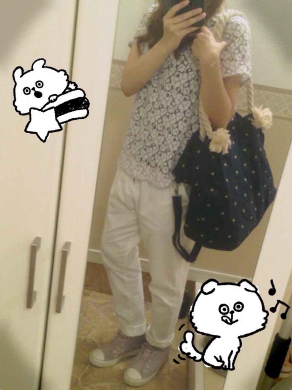 白いパンツ初めて履いたー。 難しそうに見えて、何でも合うから履く機会増えそう♡ 白パンツどころか白色ボトムス自体が約20年振りかもしれない…← うーん(´・_・`)