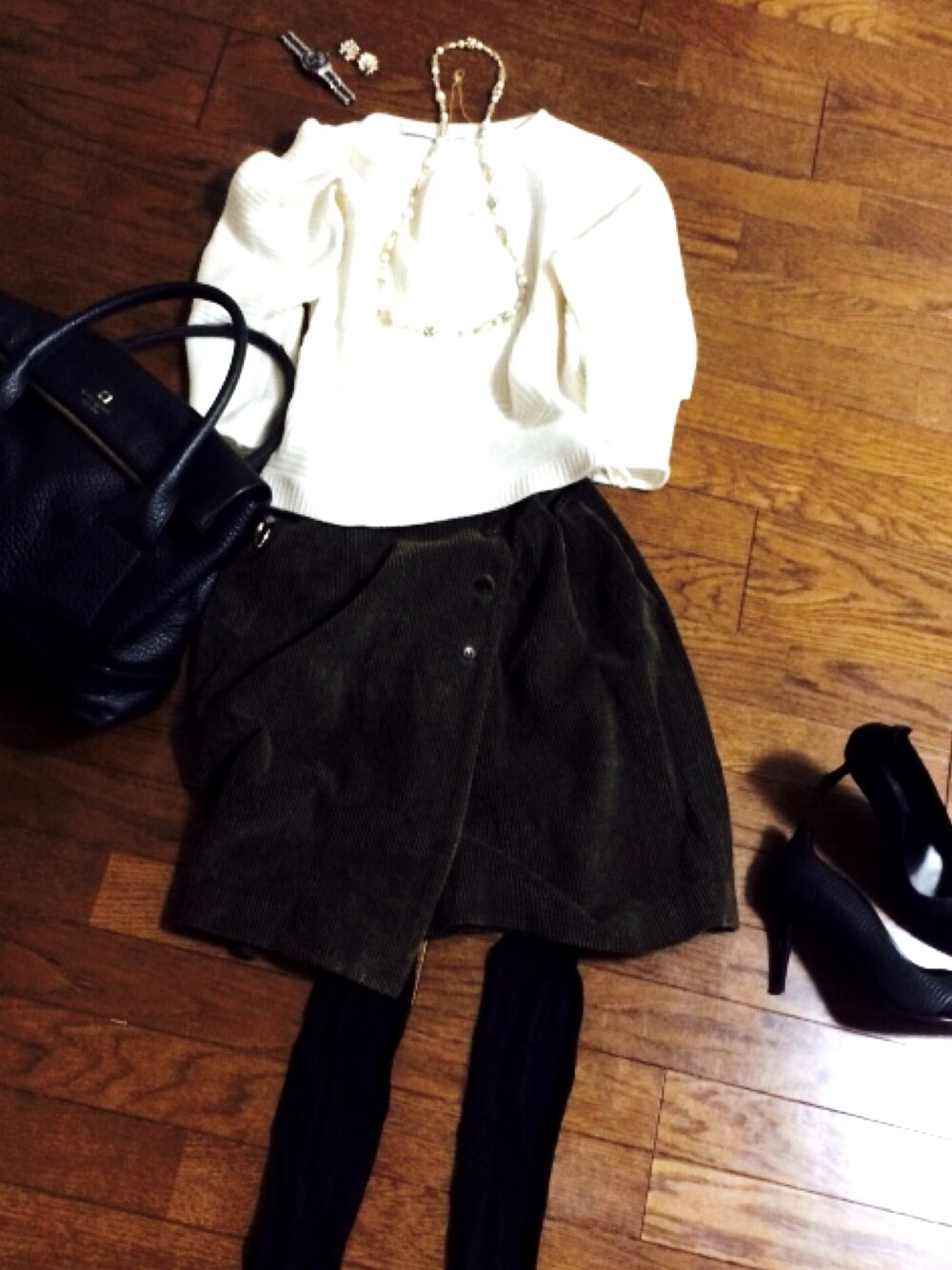 オフィスルック. tuesday UNIQLOANDLEMARIEのニット ブルックスのコーデュロイ巻きスカート