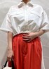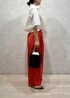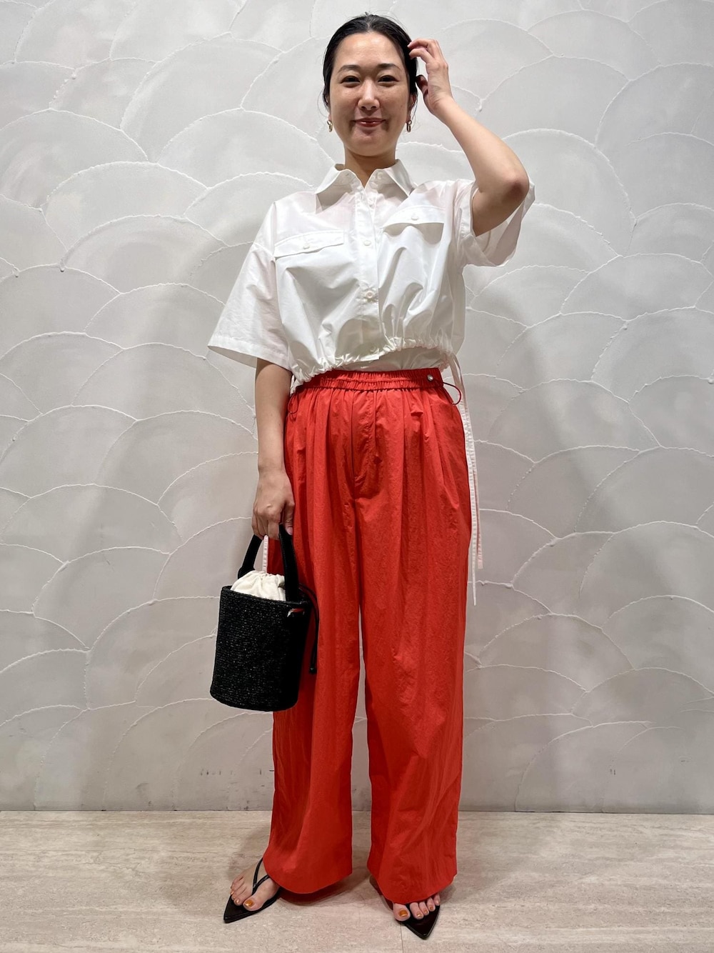 夏にピッタリなビビットカラーのパンツのご紹介です。 パッと目を引く赤のカラーがとっても素敵な一枚です。 撥水加工やクールタッチな加工が施されているので、機能面も優れたパンツです。 イージーシルエットのパンツなので、トップスにシャツを合わせて少し上品な印象で着てみました!