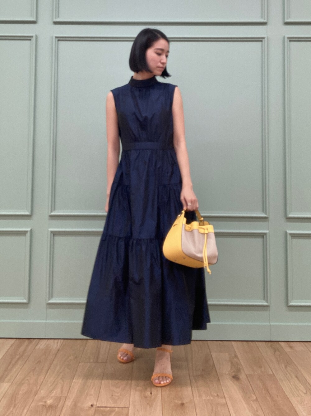 ロールネックの襟使いがクラシックさもありつつ、エレガントなワンピース。 たっぷりのティアードでドラマティックな印象にもなる1枚あると重宝するアイテムです。 ポイントにバッグやシューズでカラーを持ってくるとスタイリングのアクセントになって、様々なスタイリングが楽しめそうです。