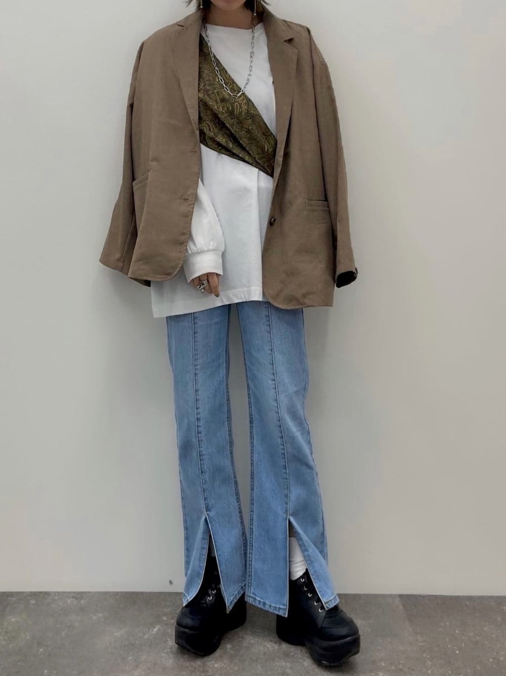 mayoのテーラードジャケット「テックリネンBIGテーラードジャケット(ユニセックス/セットアップ)」を使ったコーディネート
