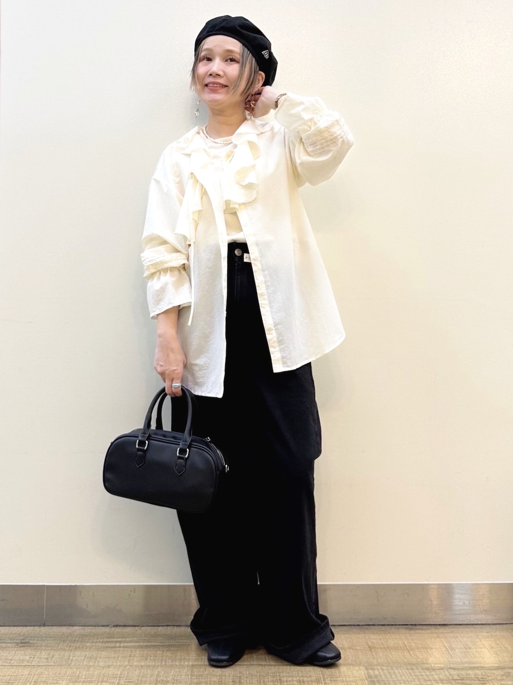 【ぽっこりお腹カバーコーデ】 身長:155 体重:現在50〜52キロ 体型:胸、お腹周りボリュームあり (腹囲85センチ) 年齢:46歳 イエベ春(カラーにとらわれず何で着ます)な ♦︎トップス →Mサイズ♦︎ボトムス→Levi's25インチSOMETHING26インチ 👨🦱メンズも着用します ♦︎Levi'sは28インチがピッタリです ━━━━━━━✄ 【シアークルーネック長袖Tシャツ】 柔らかな素材で肌触りが良く、薄手でサラッとしており、春の始まりにもピッタリ✨ ☑️普段Mサイズ着用します。大きすぎないシルエットで、いつものサイズで大丈夫です◎ 中に着てもかさばりませんでした🥰 ━━━━━━━✄ 【フリルカラーブラウス】 ボリュームと甘さを抑えたリボンタイと、袖のキャンディスリーブが、大人可愛いデザインになっています❤️ スタイル良く見え、スソにかけてギャザーシルエットで、お腹周りをゆったりカバー💯 ☑️大きな襟が小顔効果抜群🥰 ☑️後ろはお尻が隠れる着丈です♪ ☑️普段Mサイズ着用、ゆったり着用できる ━━━━━━━✄ SOMETHING 「LISA」レースアップワイドパンツ 当店でも大人気のレースアップシリーズ💖 SOMETHINGの美脚はそのままで柔らかく穿き心地💯 更に、バックスタイルが大人可愛いのが人気の秘密😍 太もも、ふくらはぎ、O脚もカバーできますよ👍 ☑️真っ黒ではなく、重すぎない、すみ黒のような、オールシーズン合わせやすいカラーです◎ ☑️サムシングは、いつも26インチかSサイズを着用しますが、いつものサイズで大丈夫です◎ 【便利な店舗受け取りご利用下さい】 店舗に気になったデザイン、サイズがないことありませんか? 試着後、合わない時はキャンセル🆗 試着後無料で丈直しもお受けしております👖✂️ ━━━━━━━✄ 【ブーツ】 生地は柔らかく、横にファスナーがあり脱ぎ履きしやすいです◎23.5か、24センチを普段履きます。 ☑️ 私の足は甲は薄く横幅は無いです。Mサイズでピッタリでした◎ ☑️ヒールもあり、つま先もスッキリしたデザインで身長も盛れスタイルUP🙌 ━━━━━━━✄ 【Instagram】 ma_pokkori ご質問などお気軽にコメントDMまで~♪ ✧︎◝︎(*´꒳`*)◜︎✧︎˖ ━━━━━━━✄ 【tiktok】ma_ma_ro