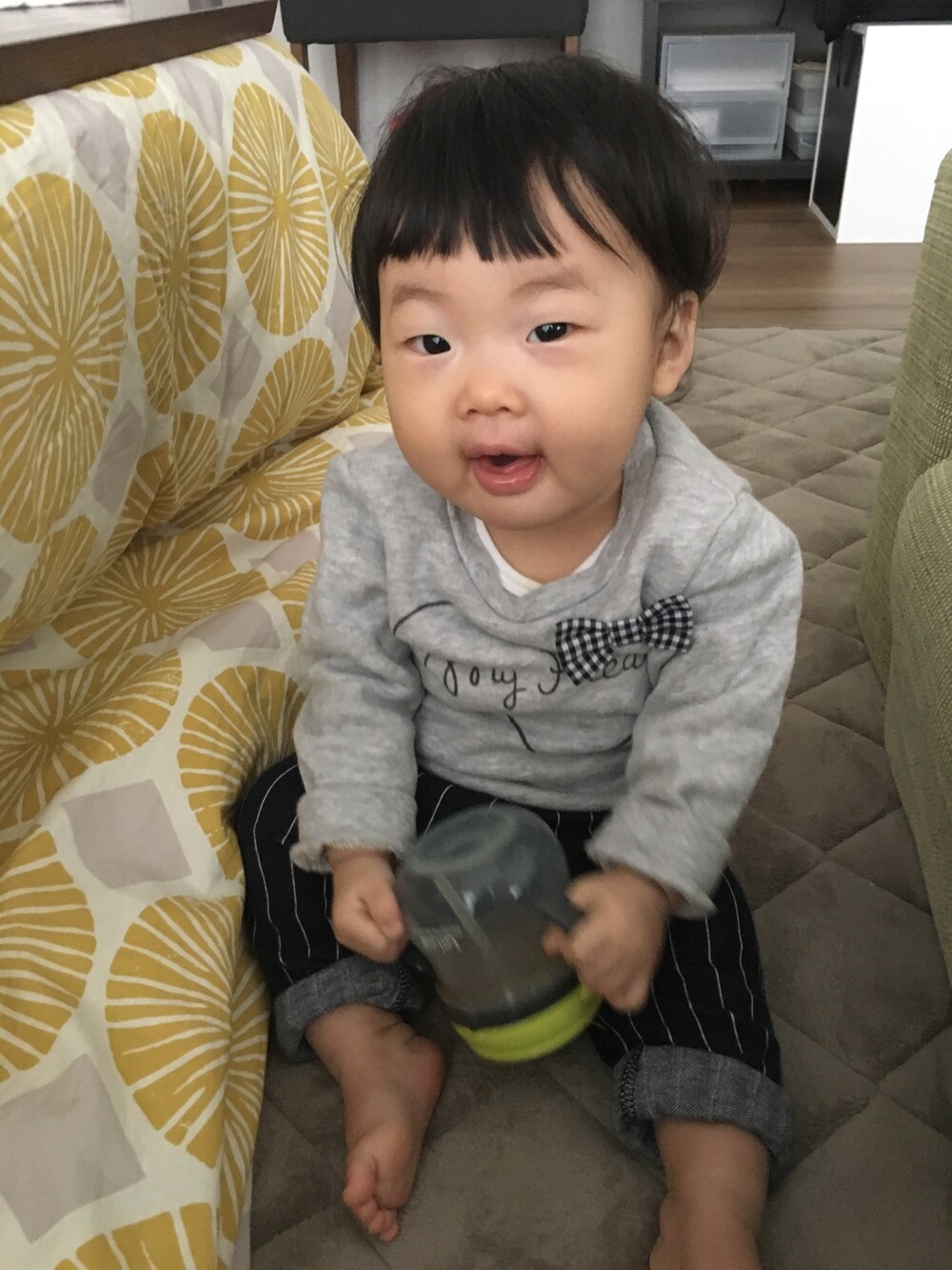 お久しぶりです💦 ヤバイ… 私のサボりぐせが出てきた😱笑 娘は元気なのでご安心ください✨ 今日はおうちコーデ✨ 同じようなコーデばっかりや😩 みなさんみたいにオシャレになりたい😭 **** 昨日義父とコストコへ行ってきました〜♫ パパは初めてのコストコに興奮してました😆笑 めっちゃ楽しかったみたい😅 たくさん買ってくれました😅 すごい申し訳なかった〜💧 その中でも小窓にある乗り物を娘に買ってくれました💡 まだ足が届かないからパパママが押すんやけど… ママ結構ツライです😅 どんだけ体力ないねん💨笑 かがんで押すから腰も痛くなる😓 でも娘は笑顔なので頑張ろ〜💨 そしてダメ元で後ろを持たせて立たせると… まさかの押しながら歩く〜Σ( ꒪□꒪)‼ しかも意外とバランス上手に取ってる〜Σ( ꒪□꒪)‼ そんなことまでできるようになったの?Σ( ꒪□꒪)‼ ママビックリΣ( ꒪□꒪)‼ つたい歩きは安定してできるようになってきたけどまさか押して歩くとは… 昨日はΣ( ꒪□꒪)‼の顔が止まらんかった〜💦 **** そしてもう1枚の小窓は最近の娘のテレビ見るスタイル👀✨ 時々見ながらスクワットが始まる😅 コタツを出したから机も出てきてちょうどいい高さなんだろね💡 でも座ってみればいいのに😅笑 だいぶぱっつん前髪に見慣れてきました💡笑