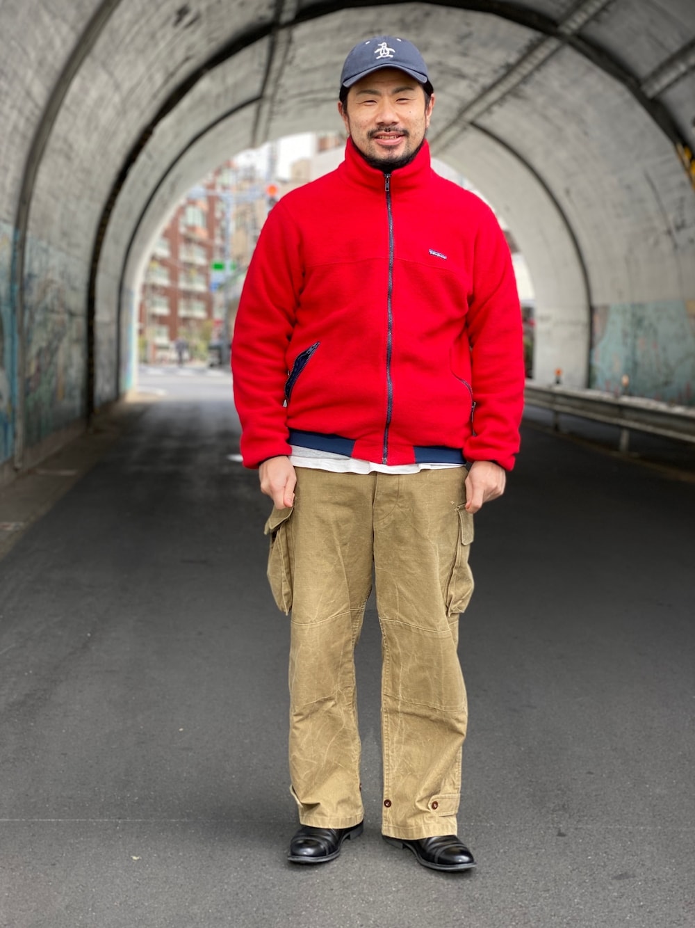 真っ赤なボアフリースジャケット。 80sの頃のパタゴニア。 m-47で合わせて。 ☝︎最近高騰してますね。びっくりです。 ワンポイントはもちろんマンシングウェア のキャップ🐧