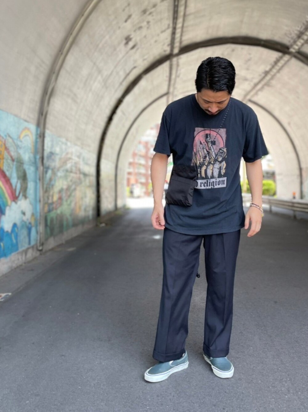 古着MIXコーデ。 全身をブラックで統一。 Tシャツとスニーカーで古着を取り入れ 上品なスラックスとのアンバランスを出したオトナカジュアルコーデ。 ロックTシャツ。 unusedのスラックス。 90s VANSスリッポン。 Penguinのサコッシュ。 同一カラーコーデは素材を変えて組むのがおすすめです♪ 今年は夏フェス盛り上がると良いですね♪