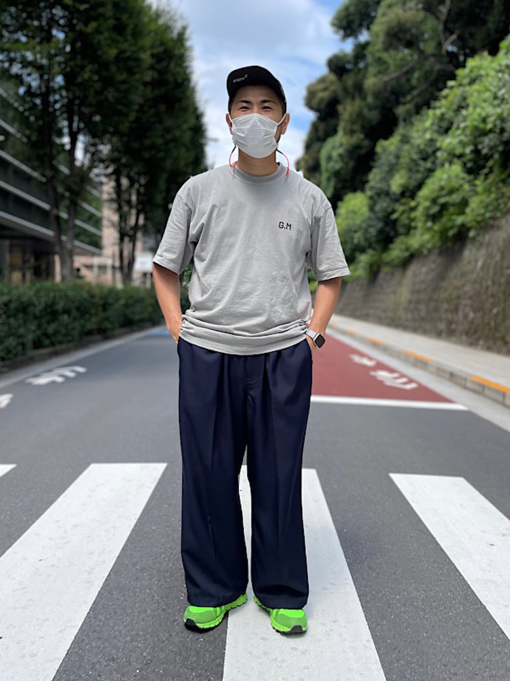 少しだけ涼しくなりましたね。 スポーツキャップとランニングシューズで スポーツミックス🏃 Tシャツのグレーにネイビースラックスで大人カジュアルな雰囲気にしています。