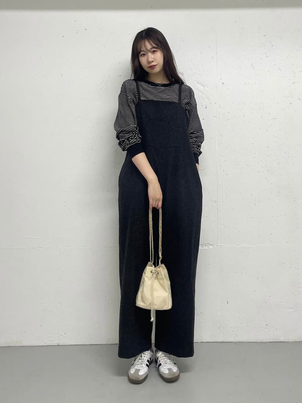 ご覧いただきありがとうございます! トップスはマシュマロのようなふわふわの生地感が気持ち良い1枚です♪ ゆったりとしたサイズ感ですが厚みはそこまでないのでサロペットのインナーとしても使えます! サロペットはボタンで紐の長さを調整できるので、高身長の私でも紐を1番長くすればしっかり丈が出ました✨