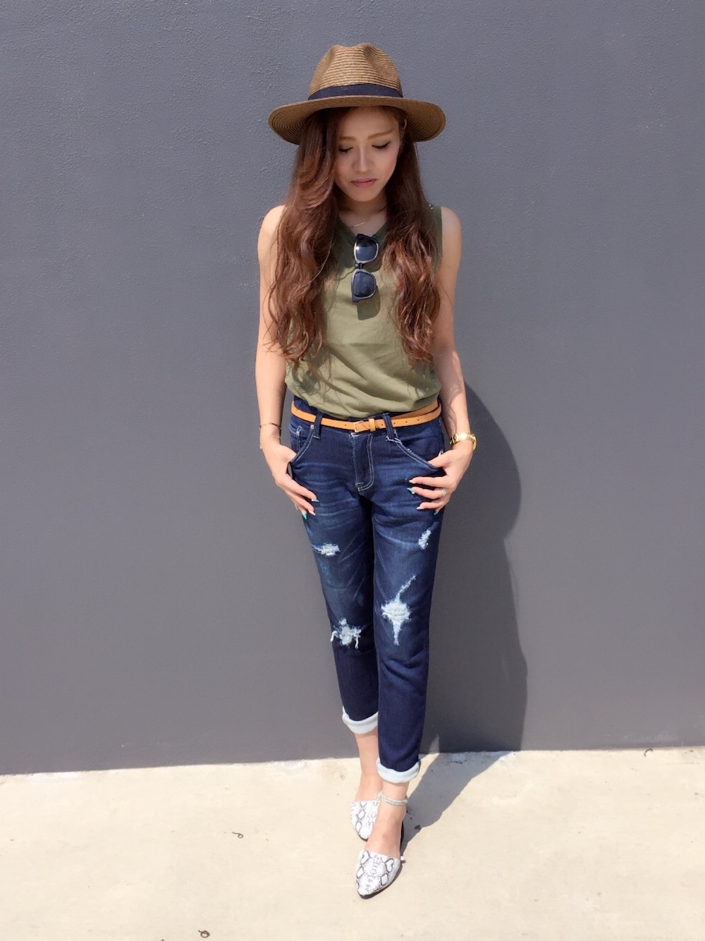 KHA✖️DENIM トップスは肩部分にスタッズ、 背中部分にフリンジと 今年らしいデザインになっています♡ ボトムスはカット素材でとても履きやすく 色もN/Wで秋CODEで使い回せるアイテムに なっています( ˘ ³˘) ポイントでパイソン柄の靴を合わせてみました!