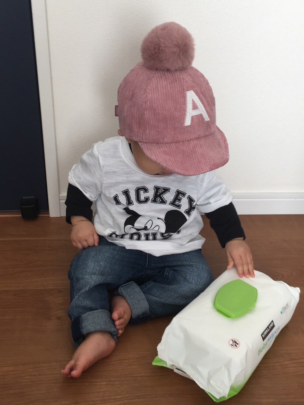 全身トータルコーデ 約4000円 コーデュロイのポンポン付きキャップが可愛い…♡ ミッキーのTシャツはSALEで600円程で買えました!