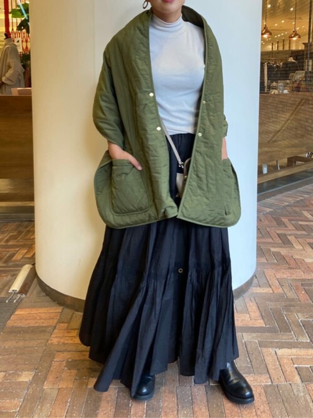 【tops】 着用サイズ:F model:159㎝ 「AWAYUKI」と名付けられたコットン生地を使用し、高級綿100%のしなやかでシルクのような柔らかな着心地のハイネックカットソー。 襟の開いたトップスやジャケットのインナーにオススメです。 色違いでも揃えていたい1枚です。 洗濯 :手洗い可 伸縮性:あり 【bottom】着用サイズ:Fサイズ ウエストの伸縮性あり、締め付け感なく、楽に履いて頂けます。 生地も軽く、歩くと動きのあるデザインに。 洗濯 :手洗い可 伸縮性:なし(ウエスト) 透け感:なし 【ストール】 キルトデザインのストール。 中綿が入っているので、軽くて暖かいです。 車移動やちょっとしたお出かけに膝掛けになったりと、重宝する1枚。 色は3色あるので、色違いで欲しくなるアイテムです。 【bag】 カーキケースが入る大きさになっています。 旅行などにも身軽に使いやすいバッグです。 【shoes】着用サイズ:38(普段23㎝) 足首までしっかりあるデザイン。 ベースはレザーですが、足首部分は合皮になっていて伸縮性があります。 ファスナーの無いデザインです。