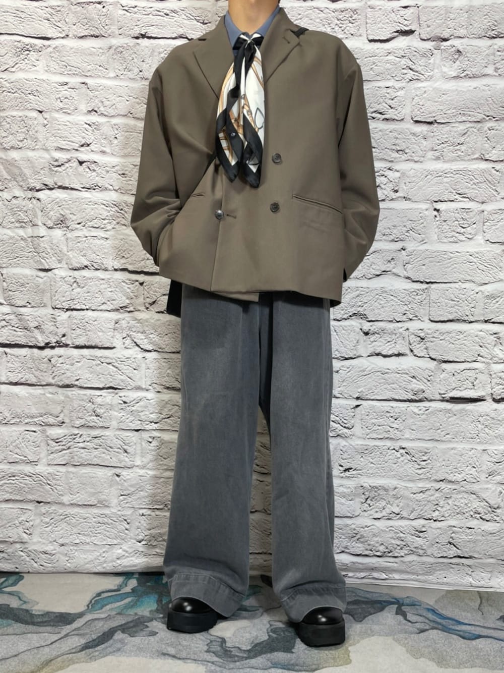 おはようございます🌞 今日はジャケットを使ったコーデ!! 青系の色合いにスカーフを用いて鮮やかな印象に仕上げました。