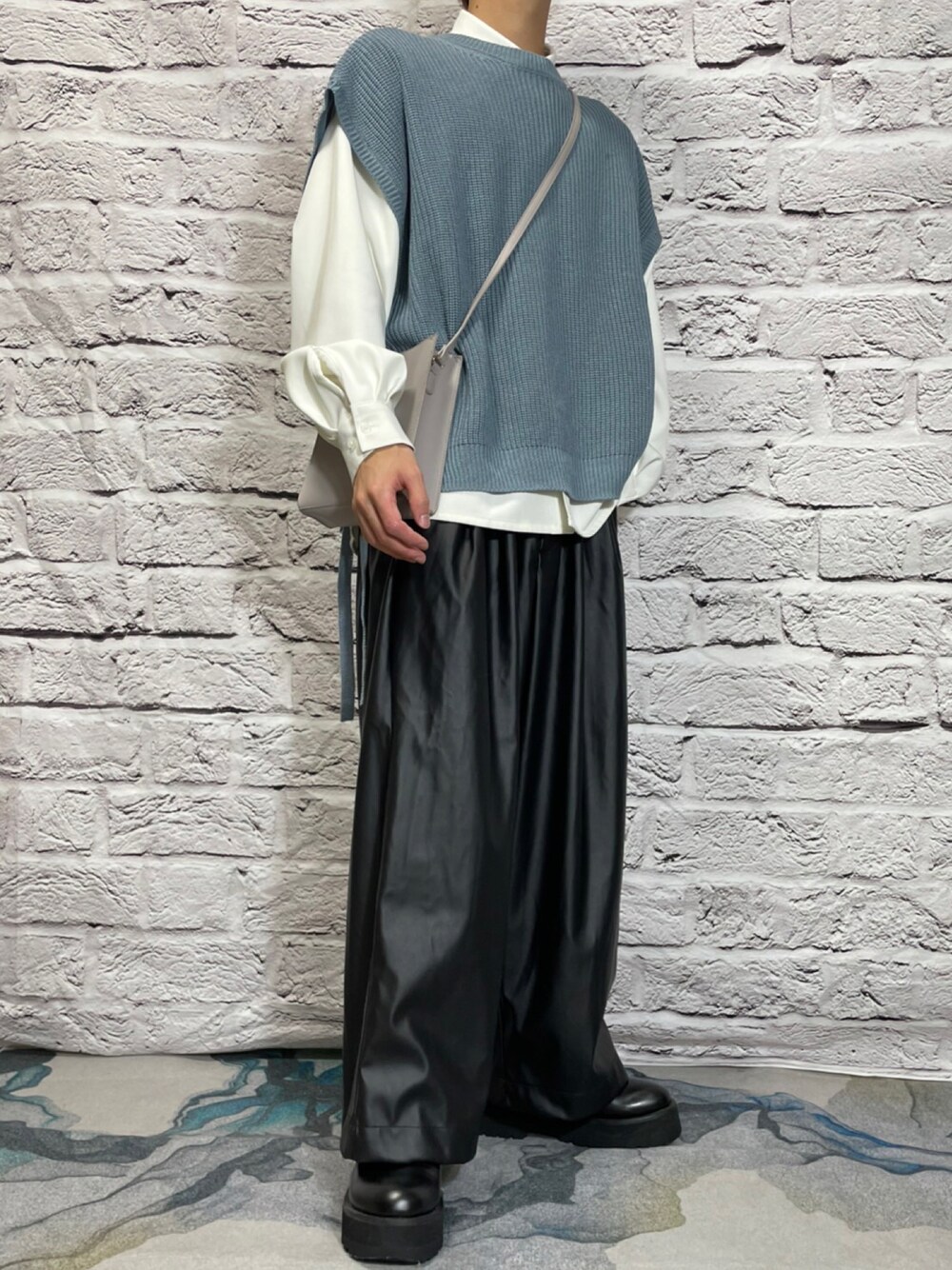 おはようございます😃 今日はレザーのボトムスを使ったコーデ 色味はブラック、ホワイト、ブルーの三色 ニットベストを加えてキレイな印象になりすぎないようにしました。