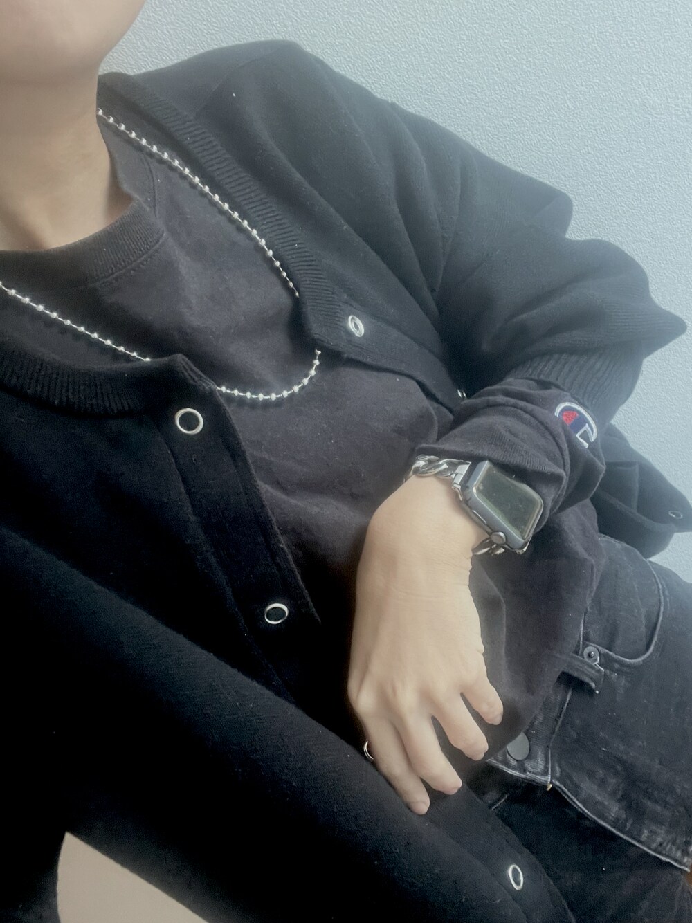 ブラック系のTシャツ/カットソー、ブラック系のデニムパンツ、シルバー系のネックレスを着用したレディースの冬コーディネートの2枚目の写真