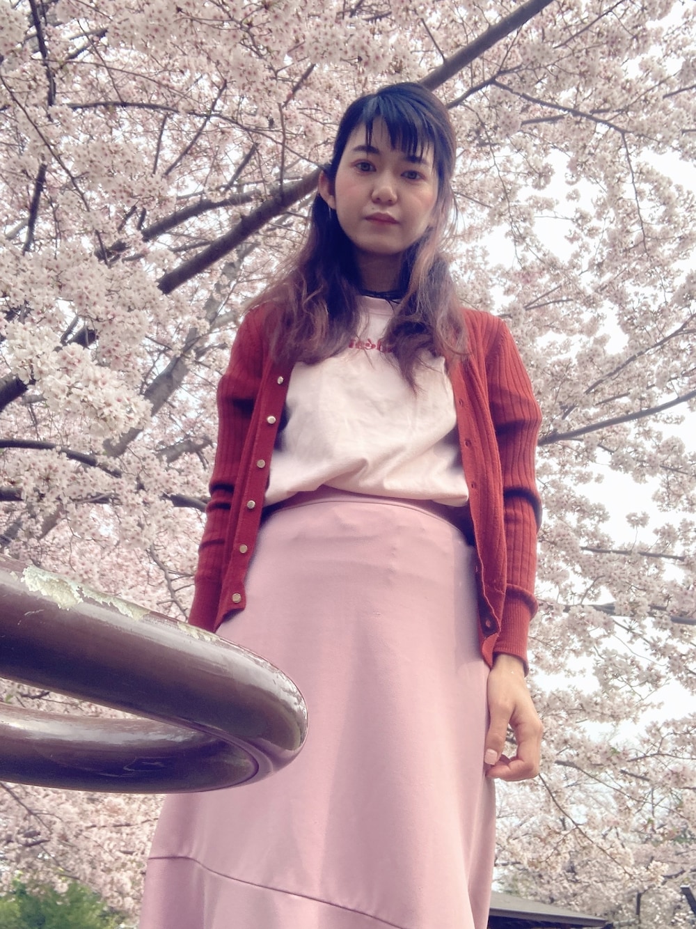 ピンク系のTシャツ/カットソーを着用したレディースの春コーディネートの1枚目の写真
