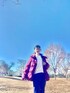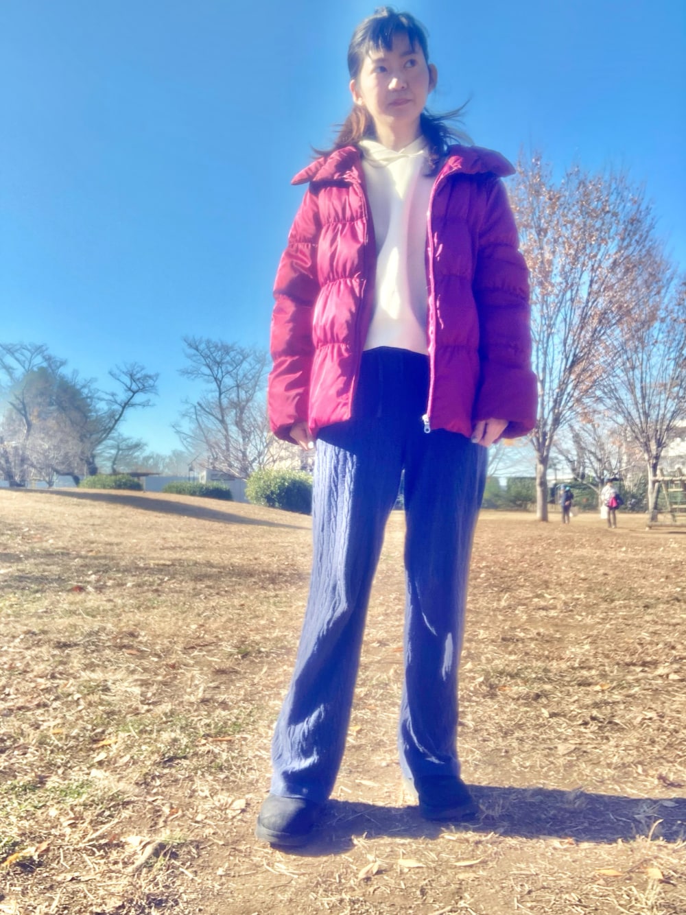ブルー系のスラックスを着用したレディースの冬コーディネートの2枚目の写真