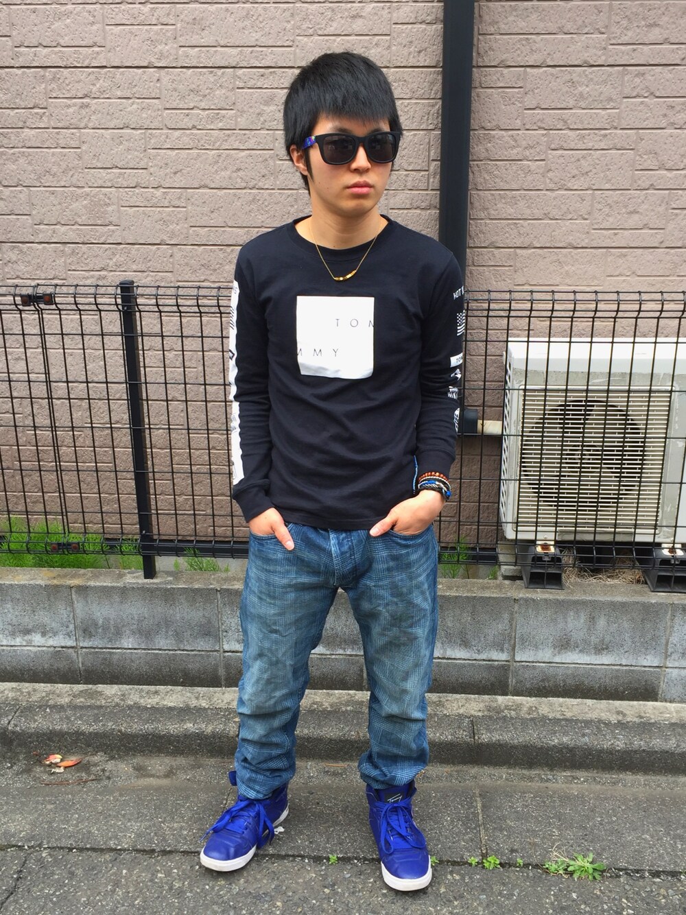 古着屋コーデ。 デニムは見にくいけどBBCのチェックデニムです。 ネックレスブレスレットはarowanaとチャイハネです。