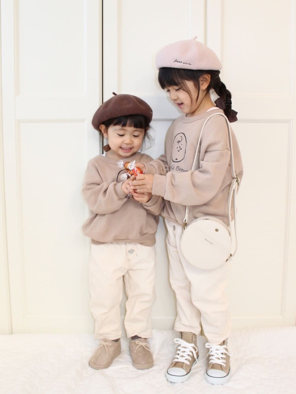 #チョコ色に染まれ🍫 ブラウン×ホワイト×ベージュで 姉妹お揃いコーデ* 手にはチョコ♡ キャップver.も小窓に〜 お誕生日にお花をくれた男の子に、 バレンタインに今年も手作りチョコを渡してきました♡ ご覧いただきありがとうございます☺︎