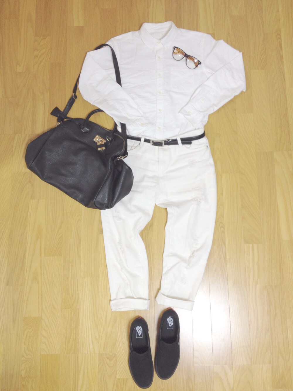 tops : gu bottoms : ? shoes : vans bag : DURAS white × black コーデ。