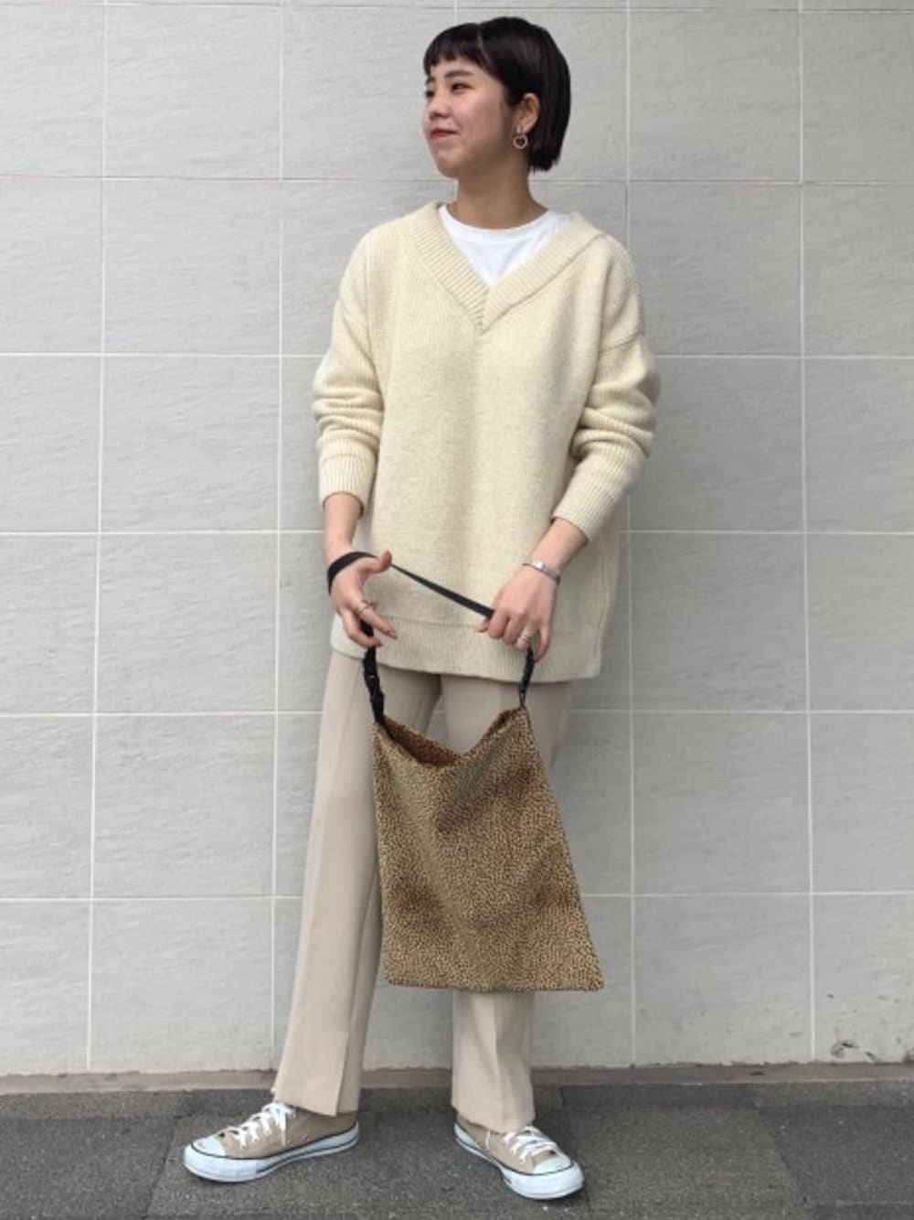 身長:168cm tops:free pants:38 アウターサンセットのTシャツは一枚で着ても可愛いですが、今の時期は重ね着にもぴったりです!ゆったりしたニットとシルエットの綺麗なパンツを合わせメリハリをつけました。チーター柄のバッグはワントーンコーデのポイントになります。