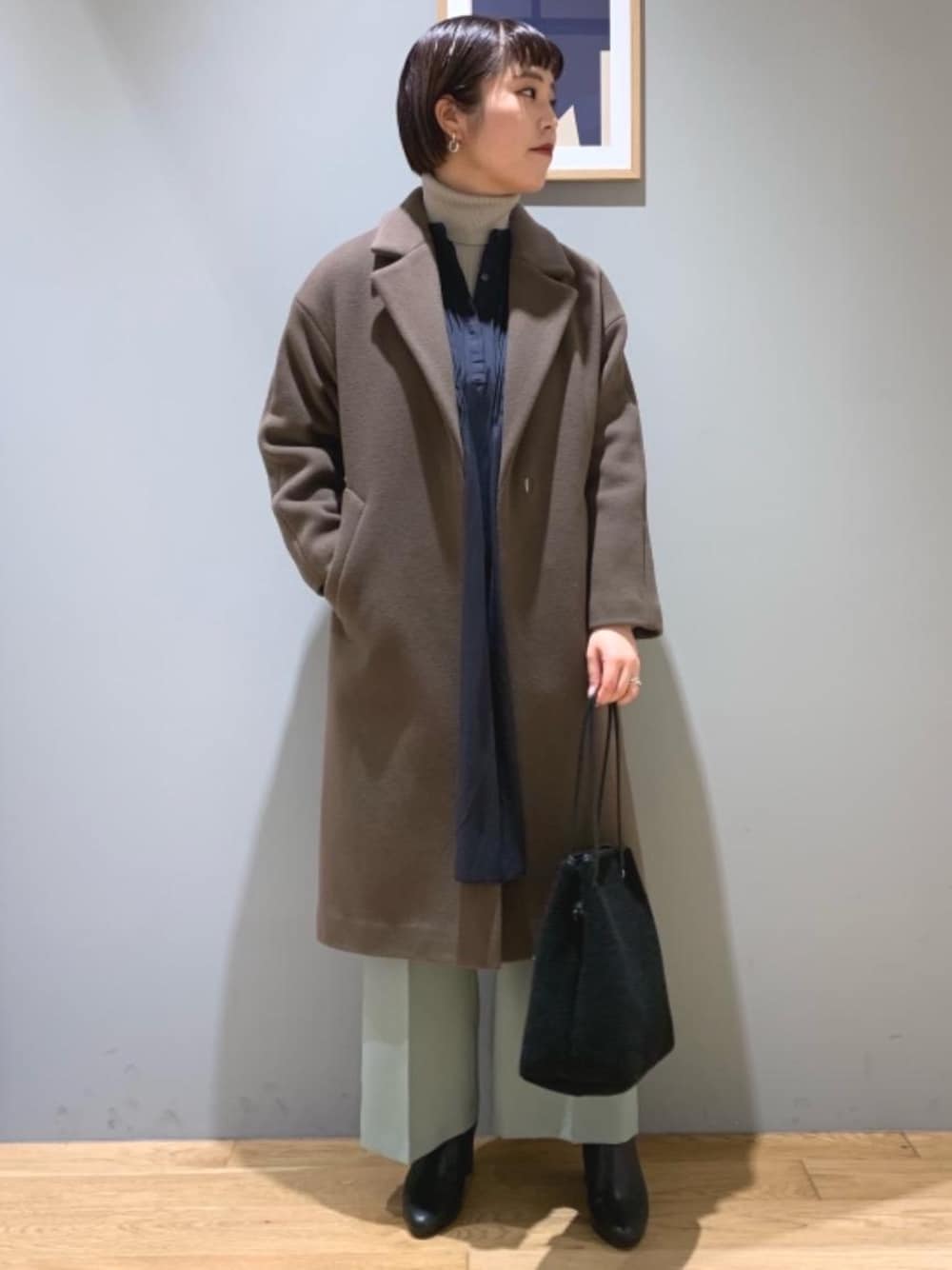 身長:168cm tops・knit:free pants:38 outer:38 shoes:L ワンピースは下にリブニットを着てもゆったりと着ることができました。差し色にカラーパンツを合わせると印象が明るくなります。カラーを組み合わせたコーディネートなので、小物はブラックで揃えて、統一感を出しました。