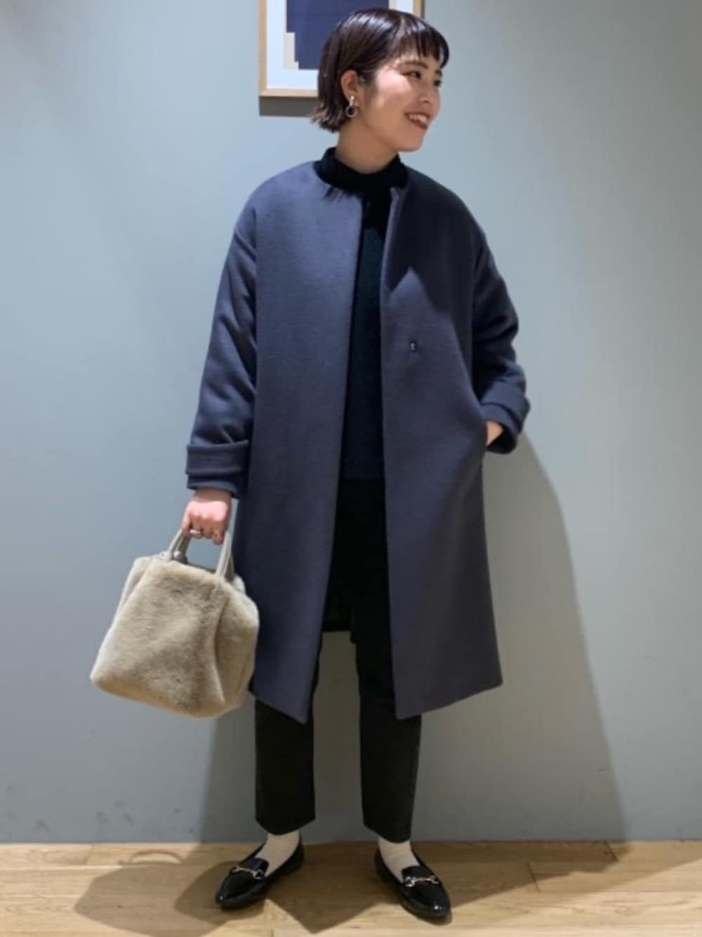 身長:168cm outer:38 blouse.knit:free pants:40 shoes:L アウター38サイズで着用しています。ブラウス、少し厚みのあるニットを重ね着した上に着用し、ぴったりなサイズ感でした。ブラウスを合わせたレイヤードで、カジュアルになりすぎず、綺麗めカジュアルなコーディネートにしました。