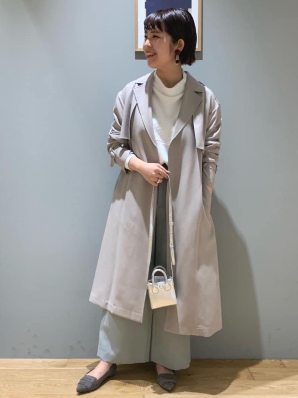 身長:168cm outer:38 tops:free pants:38 shoes:24.5 ラインの綺麗なトレンチコートは紐を後ろで結んで着用しています。パンツは爽やかなくすみカラーで、コーディネートのポイントになります。全体的にゆったりとしたシルエットなので、シルバーのバッグをアクセントにしました。エコバッグ付きなのも嬉しいです!