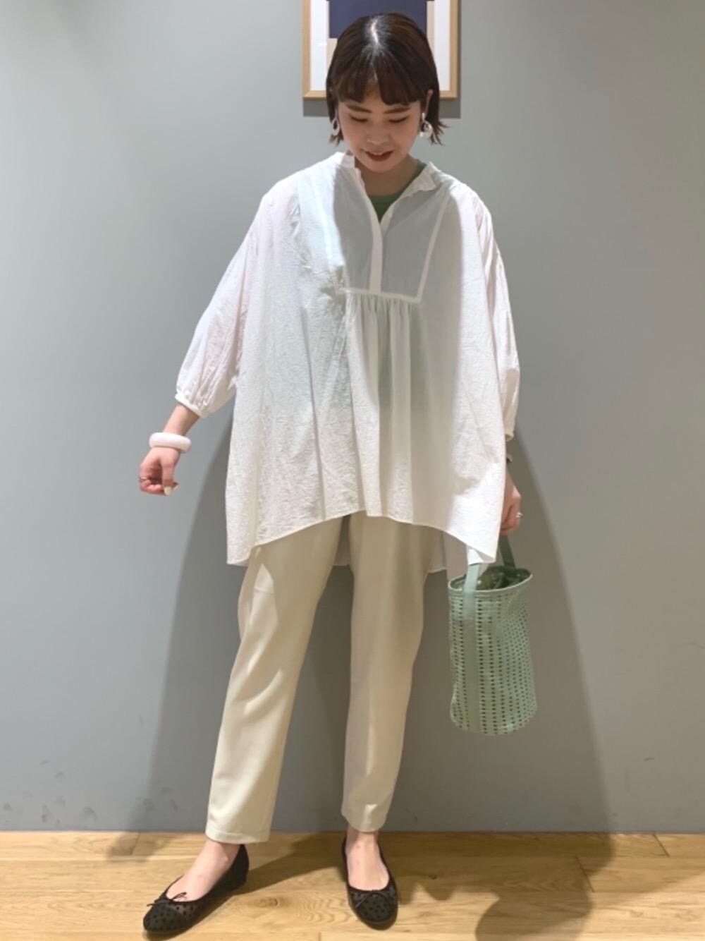 【身長:168cm tops:allfree pants:38 shoes:24.5】 透け感のあるブラウスは、カラーのインナーと重ねると、違った雰囲気で楽しんでいただけます。ゆったりとしたシルエットなので、テーパードパンツですっきりとした印象になるよう合わせました。