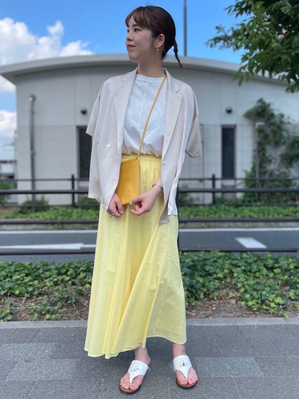 【身長 168cm】 スカートとバッグの色味を合わせ、明るい印象になるようスタイリングしました。