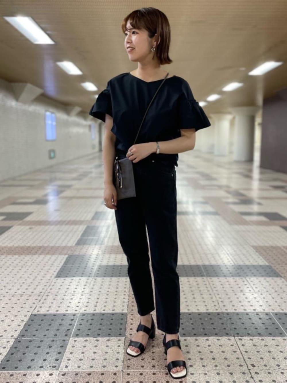 【身長 168cm】 デザイン性のあるブラウスをブラックデニムに合わせ、綺麗めにスタイリングしました。