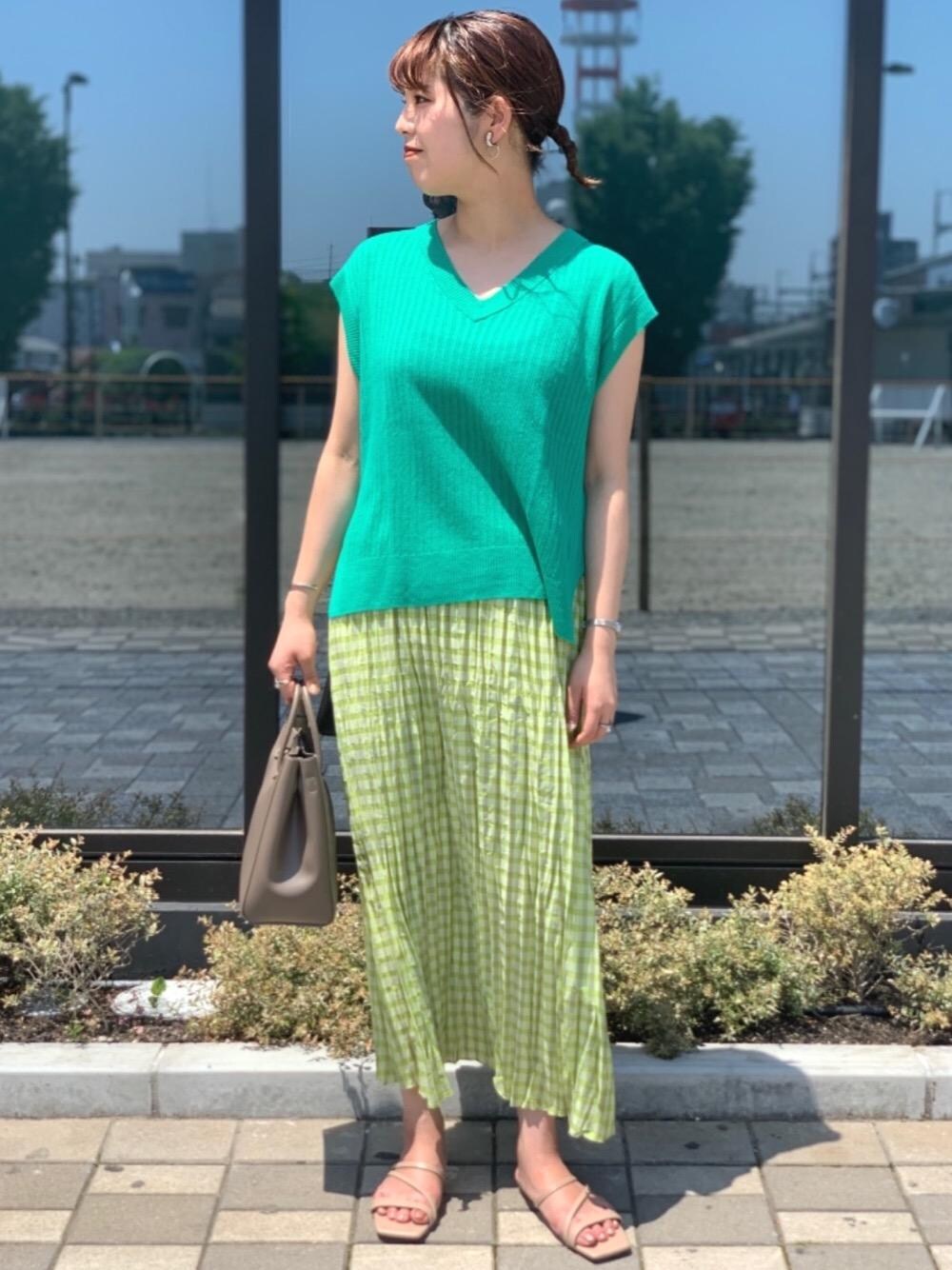 【身長 168cm】 トップスとスカートを同系色で合わせる事で統一感を出し、程よくリラックス感のあるスタイリングにしました。