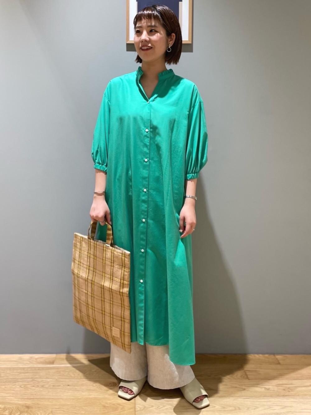 【身長 168cm】 カラーの鮮やかなワンピースは一枚で着映えするアイテムなので、パンツや小物をベーシックなカラーで合わせました。