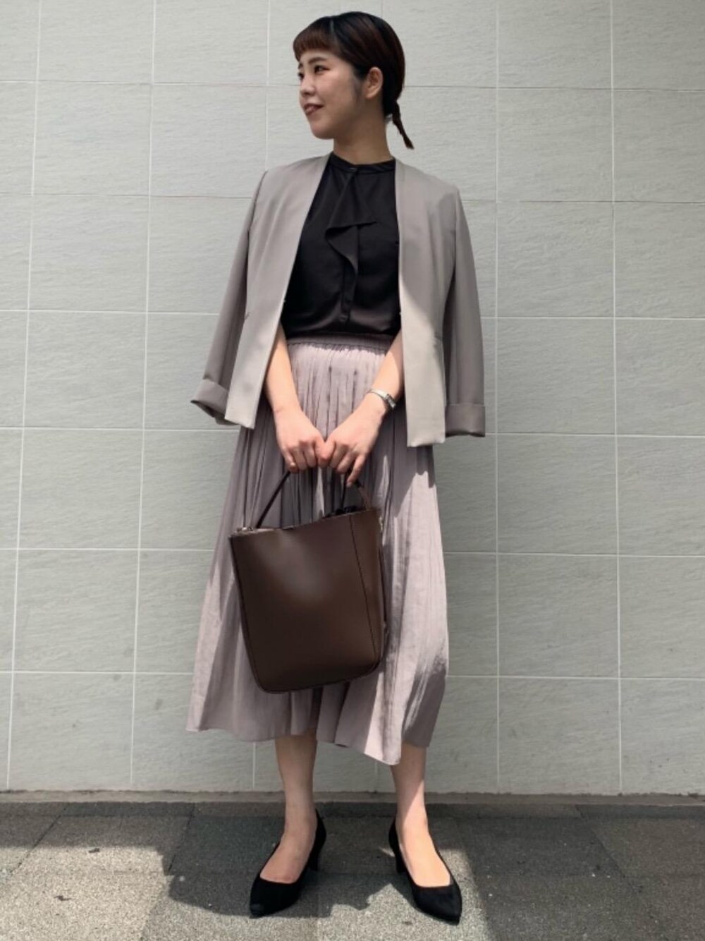 【身長:168cm】 スカート、ジャケットの色味を合わせ、統一感のあろコーディネートにしました。