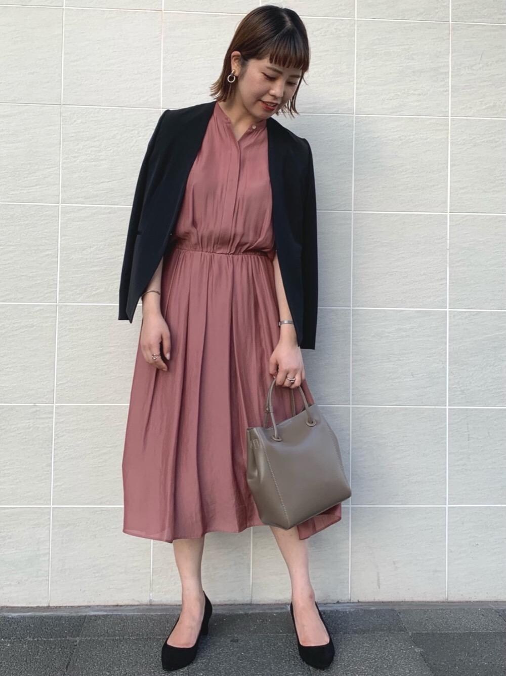 ●身長:168cm ●普段サイズ:ジャケット38or40/シューズ24.5cm 【サイズ感】 ジャケット:標準的 ワンピース:標準的 シューズ:標準的 【コーディネートポイント】 一枚で着映えするピンクのワンピースをブラックアイテムと組み合わせ、オフィスでもご着用頂けるスタイリングにしました。ベージュなど柔らかいカラーを合わせても、雰囲気を変えて楽しんで頂けます。