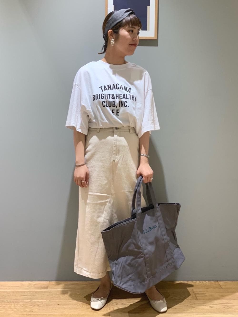 ●身長:168cm ●普段サイズ:トップスM/ボトムス38/シューズ24.5cm 【サイズ感】 トップス:ゆったり スカート:標準的 シューズ:標準的 【コーディネートポイント】 Tシャツにデニムスカートのカジュアルなアイテムをホワイトカラーで合わせ、程よく綺麗めな印象になるようスタイリングしました。統一感が出るよう、バッグとターバンの色味を合わせたところもポイントです。