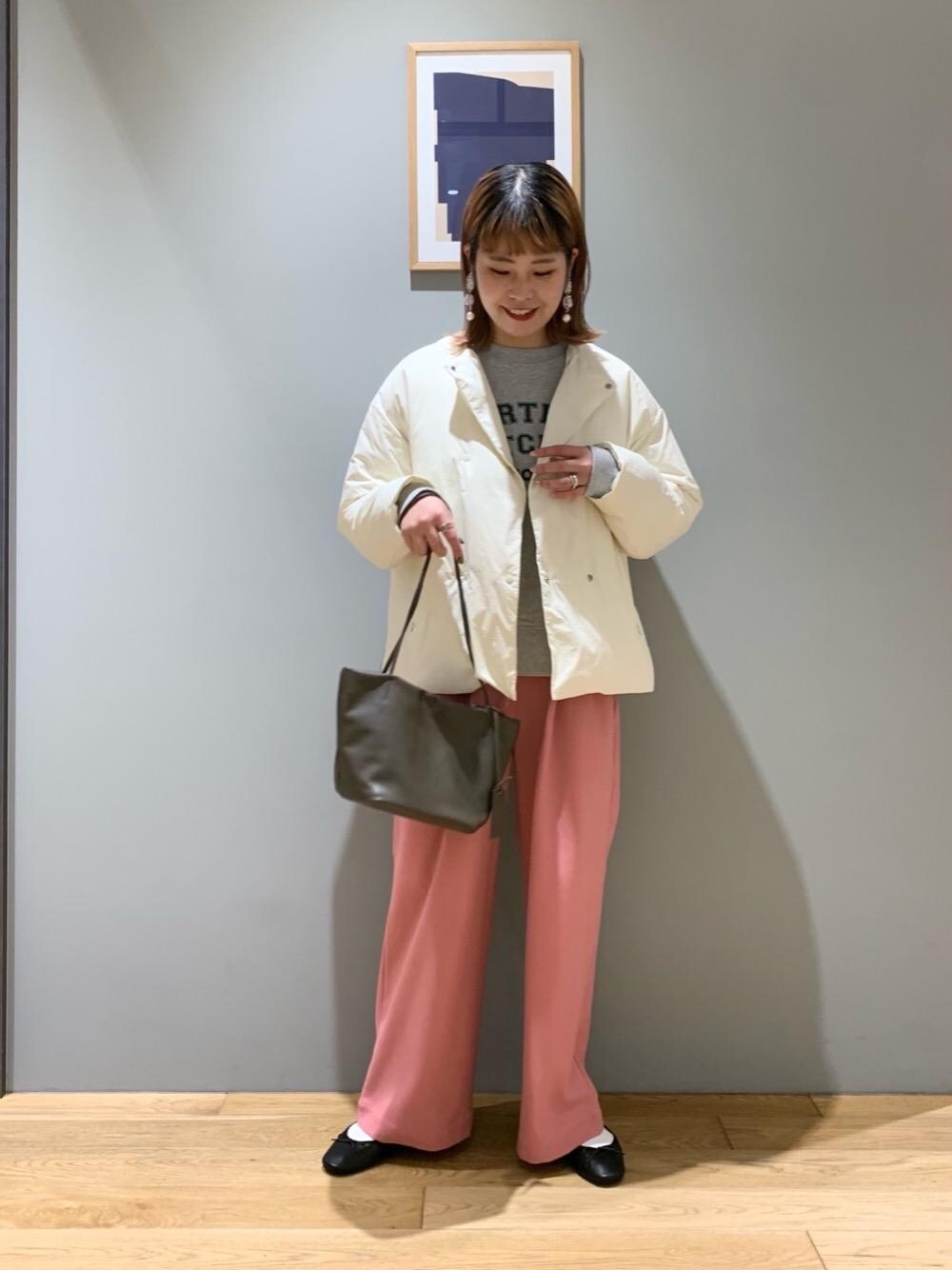 ●身長:168cm ●普段サイズ:トップスM/ジャケット38or40/ボトムス38/シューズ24.5cm 【サイズ感】 トップス:ややゆとりあり アウター:ゆったり ボトムス:ゆったり シューズ:標準的 【コーディネートポイント】 スウェットにリラックス感あるパンツを合わせ、カジュアルにスタイリングしました。ダウンはショート丈なので、ワイドパンツと合わせてもすっきりとした印象で着用できました。