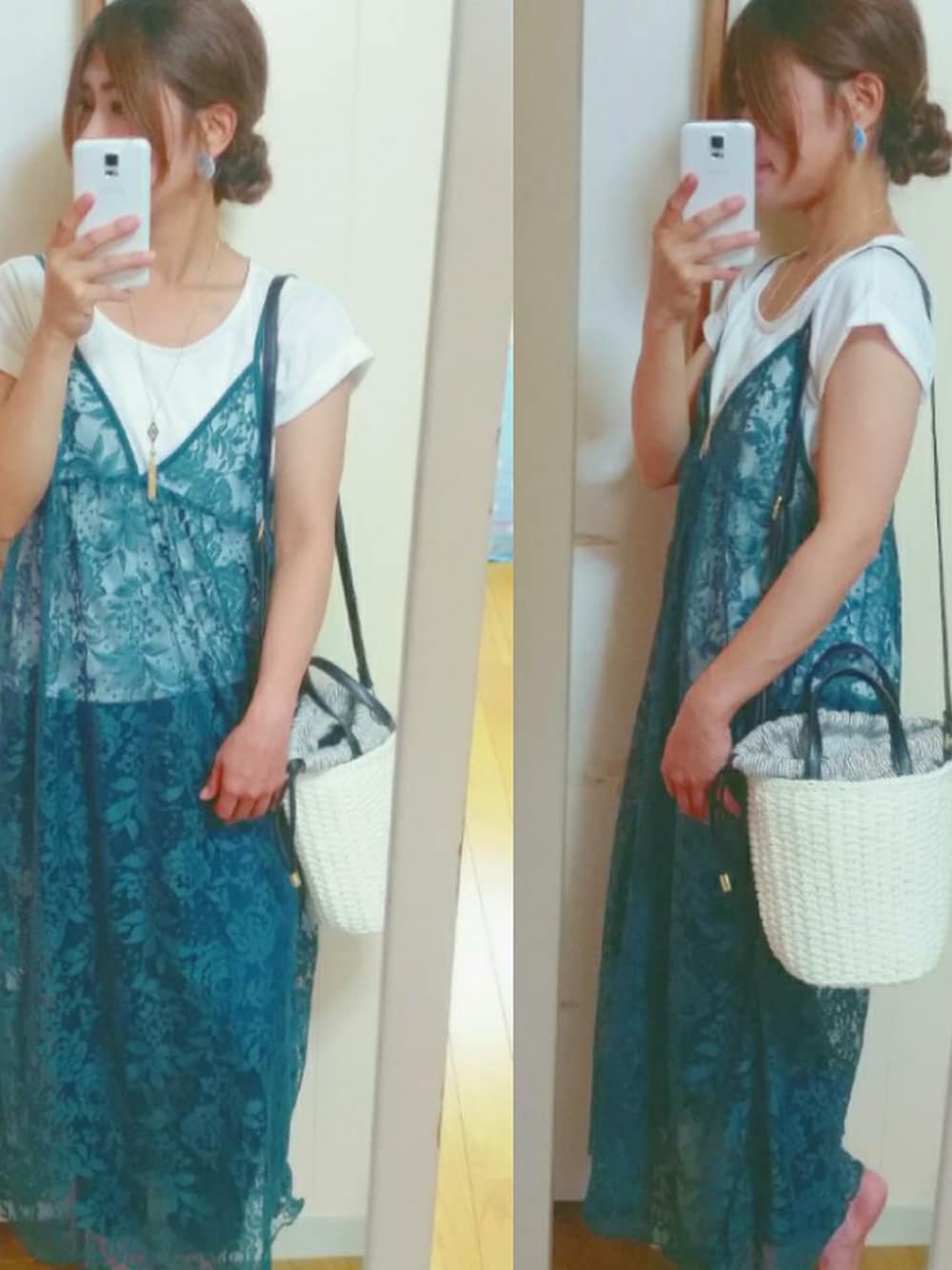 昨日のコーデ😻♥ ママ友さんとお出かけでした❤ レイヤードワンピース 購入時ホワイトと悩んだけど グリーン選んで良かったッ😛💕 やっぱり可愛い❤