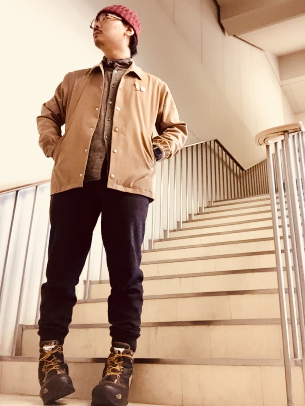 おはようございます、あやとです。 クラシックなアウトドアスタイル。 コーチジャケットに、 ノーカラーツィードシャツ、 クビにバンダナ、 ウールのイージーパンツ、 マウンテンブーツ。 今日もお仕事頑張りまーす!