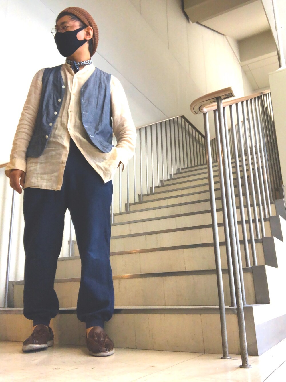 おはようございます、 あやとです。 緊急事態宣言、延長しましたね。 早く終息してほしいものです。 コーデは、 メッシュベレー帽 リネンのロングシャツ デニムベスト デニムスウェットパンツ 編み込みスリップオン ブラウン系と、デニムの相性は抜群です。