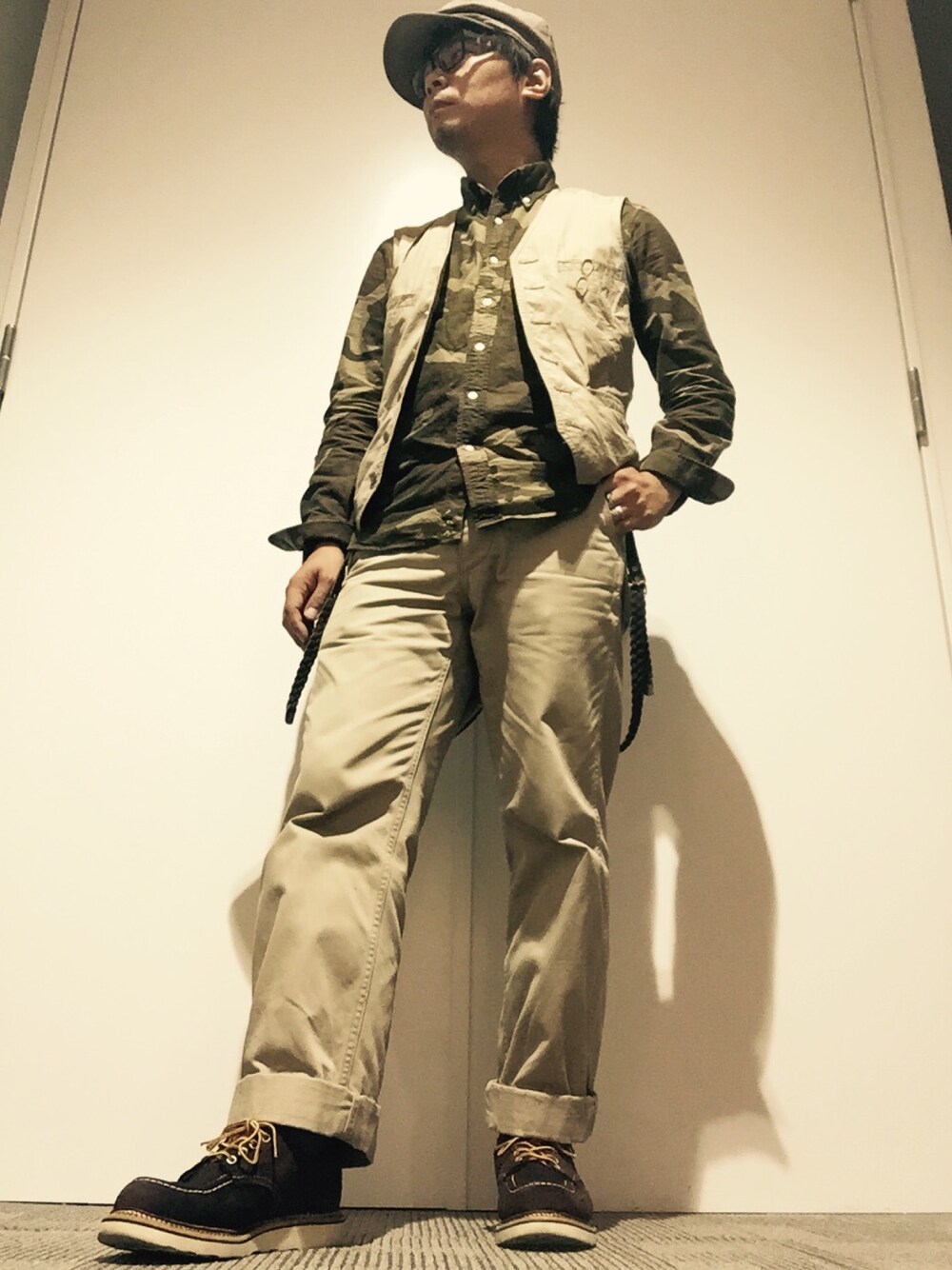 今日はワークスタイル。 統一感あるカラーコーディネートで、カモフラワークシャツがポイント。 新作の別注レッドウィングはスウェード素材。