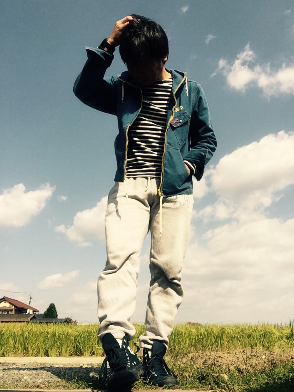 昨日はオフでした。 畑に水やり、ワンちゃんのお散歩、 法事の準備。 のんびり過ごして、夕方、お昼寝してしまいました。 アウターは、インディゴ染めのヨットパーカーに、ボーダー、スウェットパンツに、コンバース。秋のネイビーアイビーです。 久々に帽子被らないコーデ(^ー^)ノ