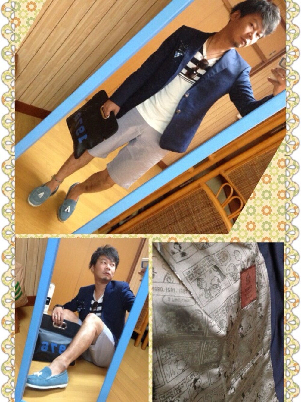 今日はショーツを使ったマリンスタイル。ジャケットは、タケオキクチのオーダーで作った紺ブレ。綺麗なジャケットは、裏地はスヌーピー柄と、可愛さをプラス。 ショーツは外しで、ユニクロのブルーギンガムチェック。